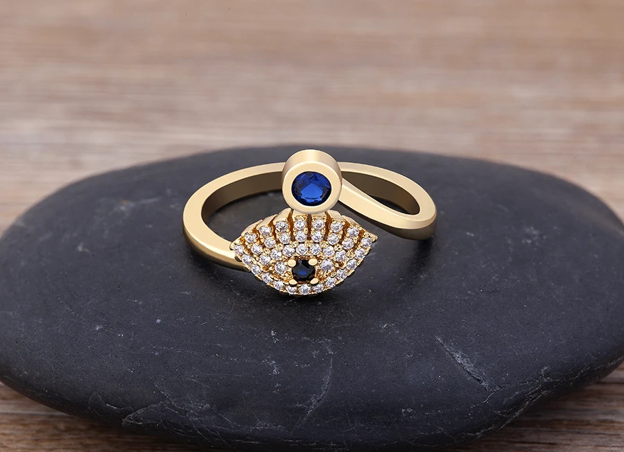 Meaningful style meets protection in our Evil Eye Ring For Women, a luminous golden ring set with a deep blue evil eye and a halo of sparkling zircon crystals. This modern charm with an ancient symbol is designed to be your everyday talisman, a piece that says you care about warding off negativity while celebrating your personal style. The polished golden finish frames the blue eye beautifully, and the light-catching zircons add a refined glow that looks elegant from brunch to black tie.